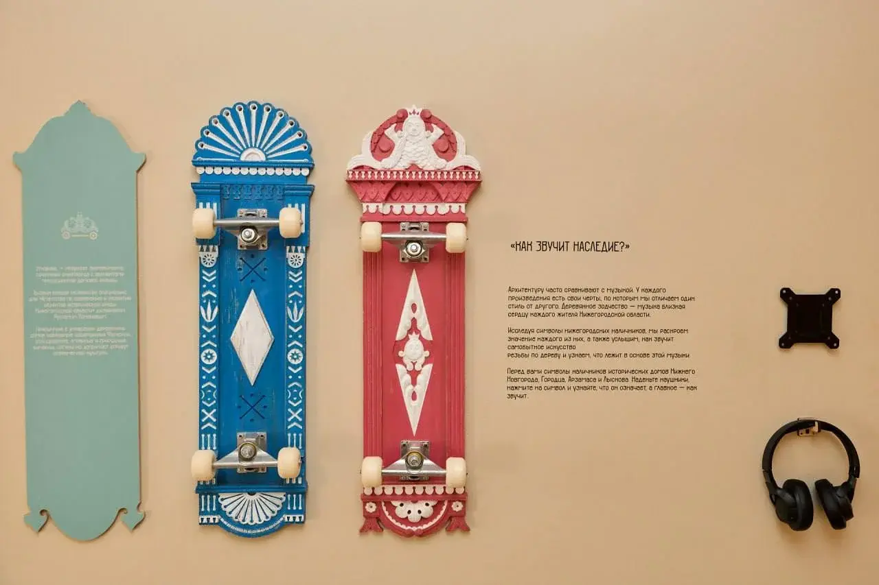 Надев наушники и выбрав символ традиционной обережной резьбы старинных домов Нижнего Новгорода, Городца, Арзамаса и Лыскова на интерактивном мониторе, можно услышать их звучание. Специально для этого нижегородский композитор Анна Лутошкина написала трек, вдохновленный символов наличников.